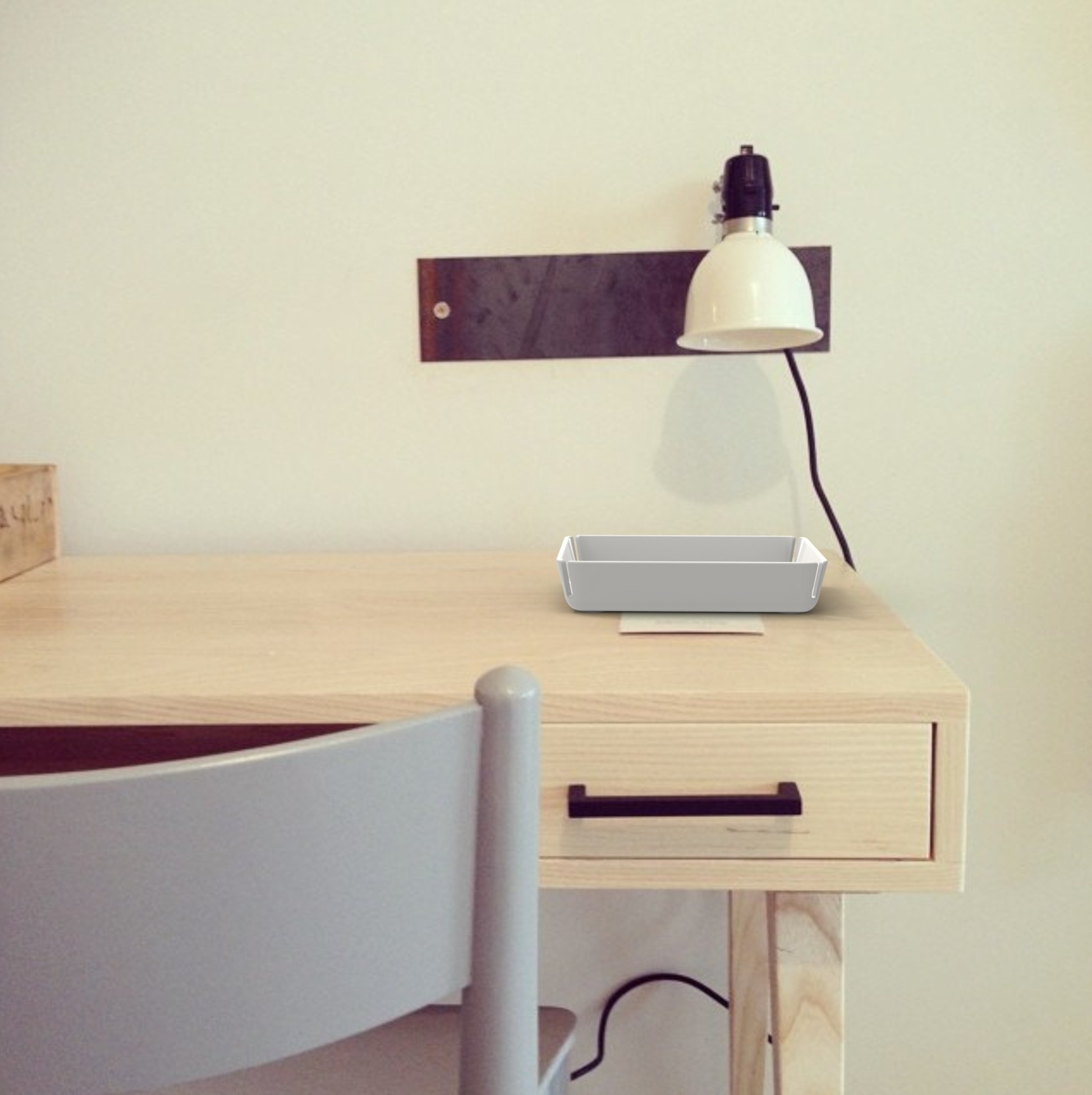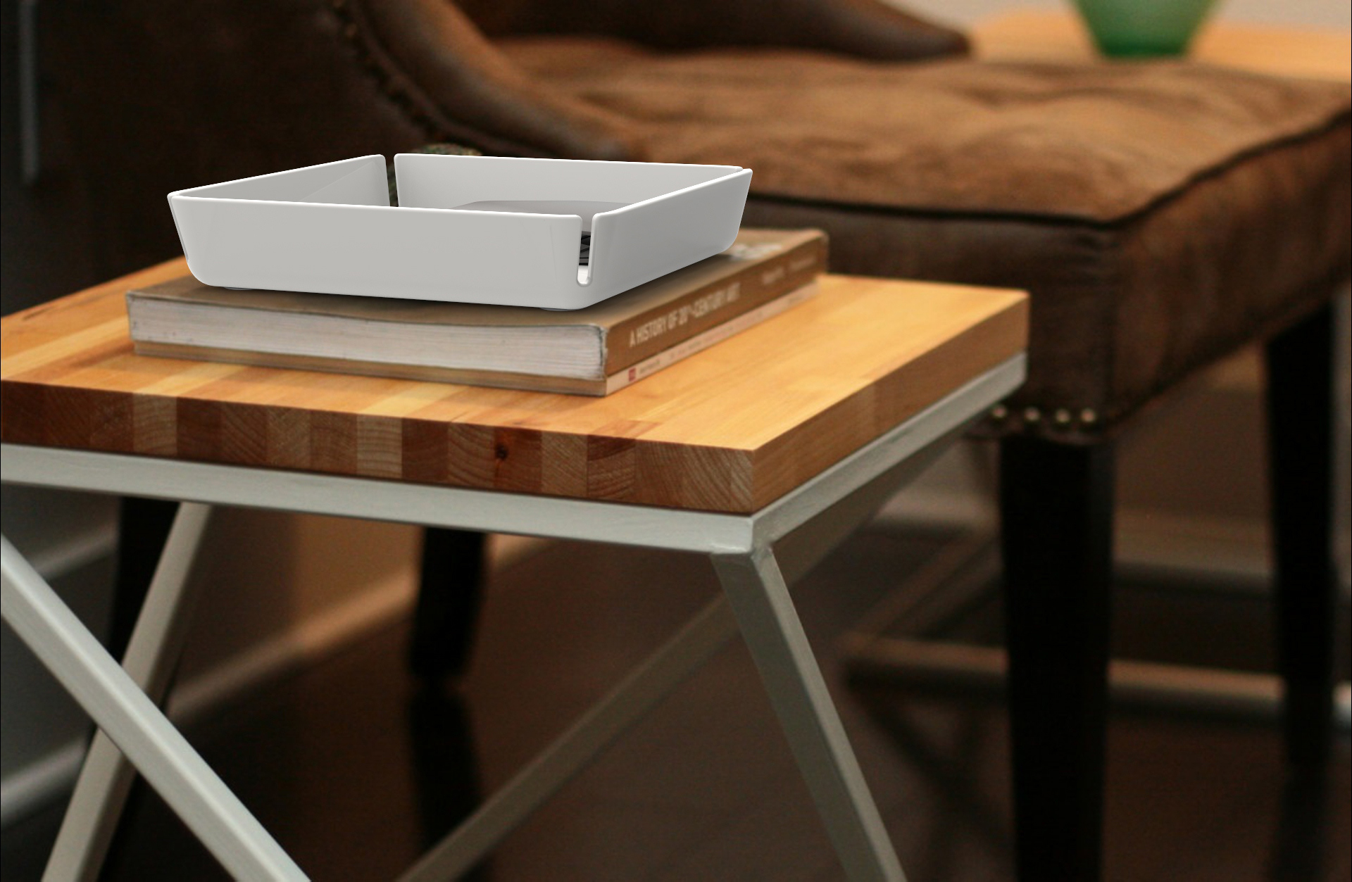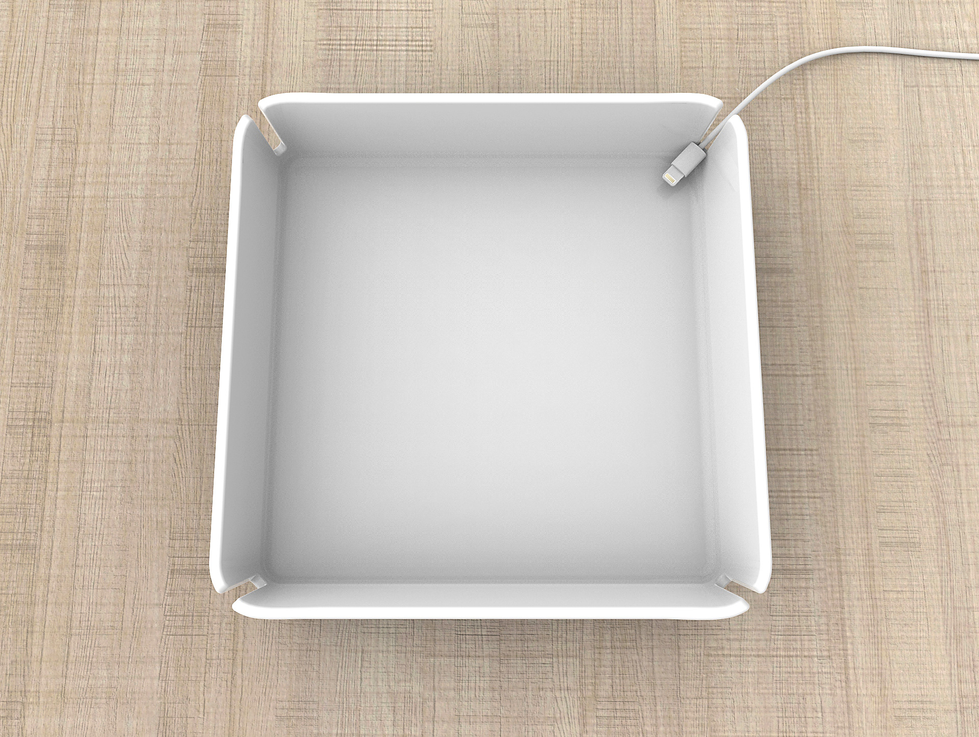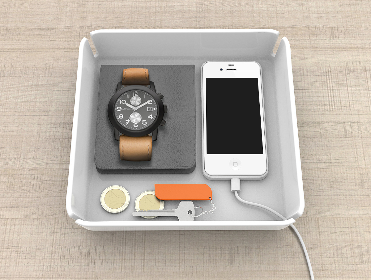 Contemporary storage solution for pocket items, loose change or discreet smart phone charging. The notches on all four corners assist with cord management.