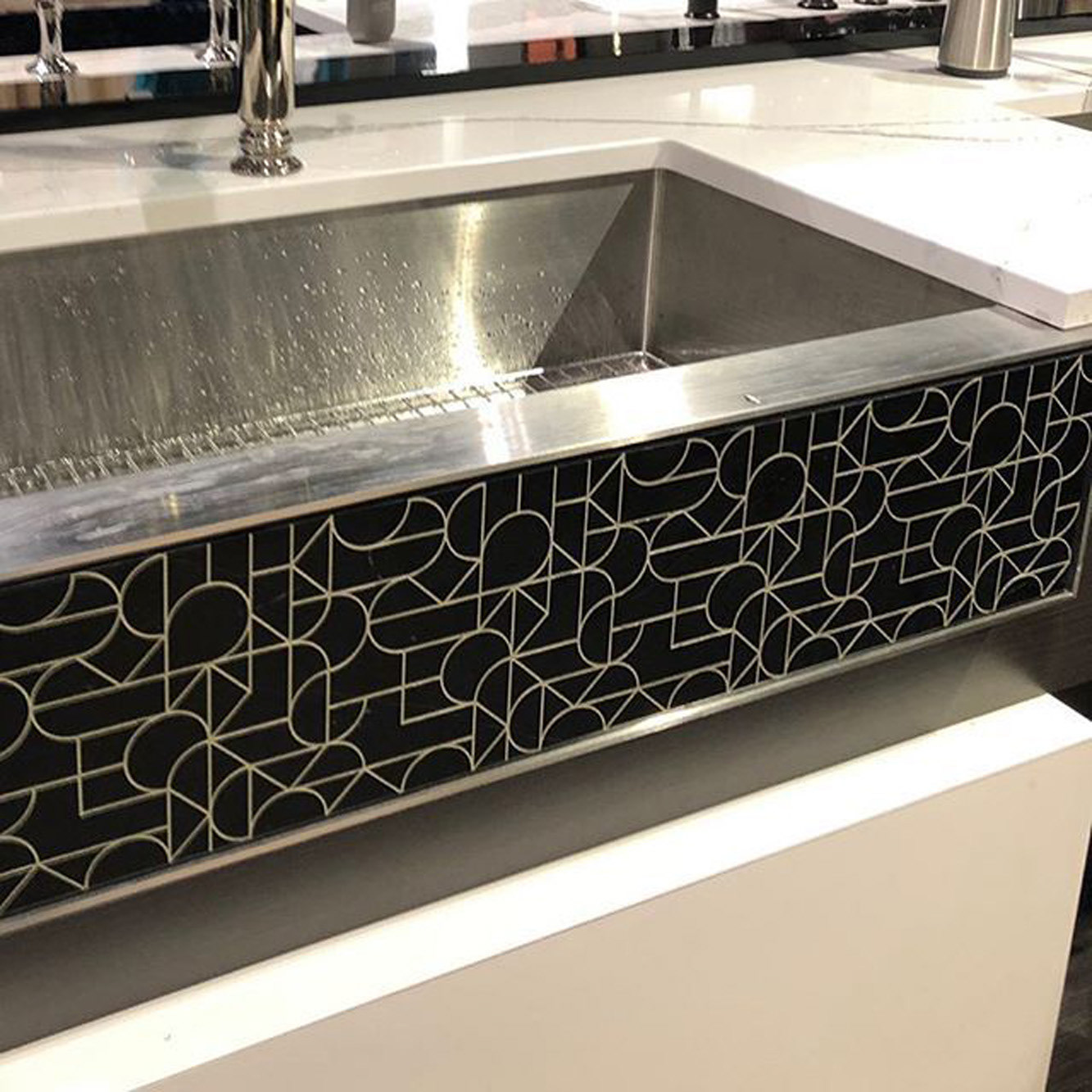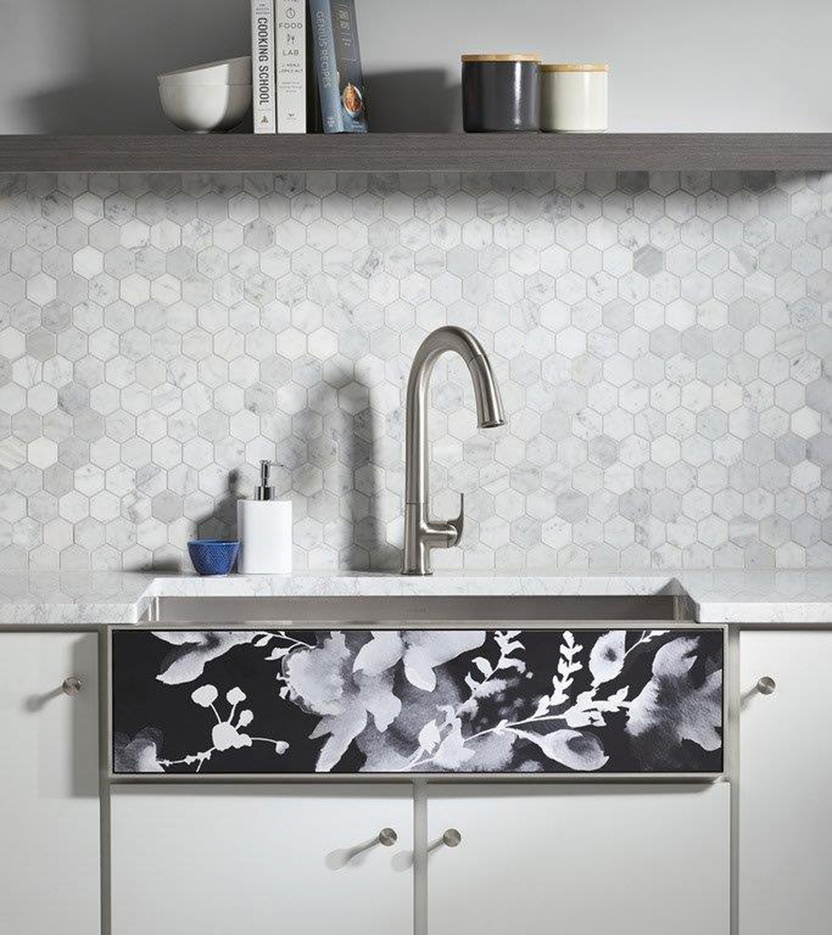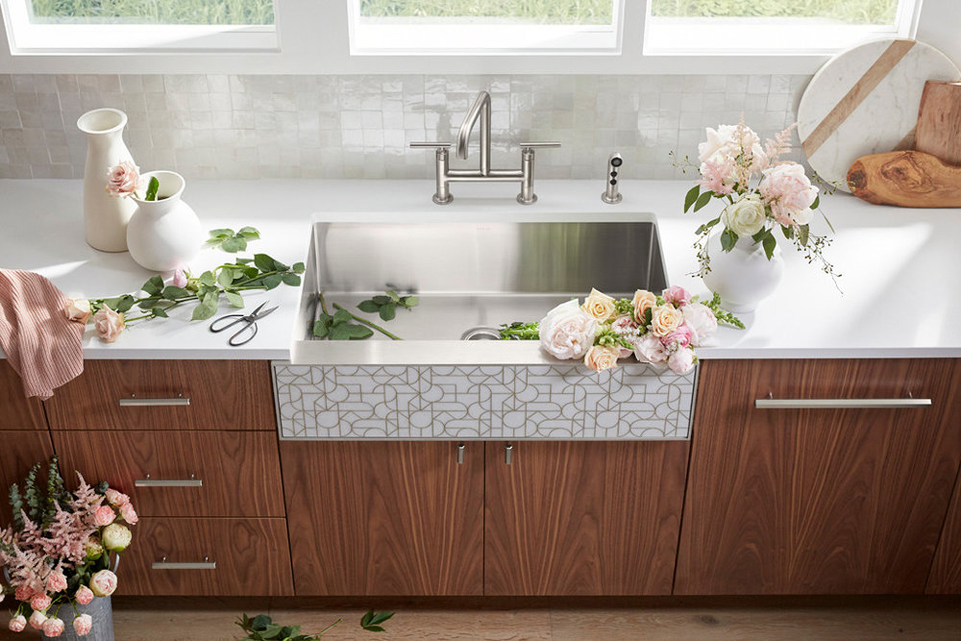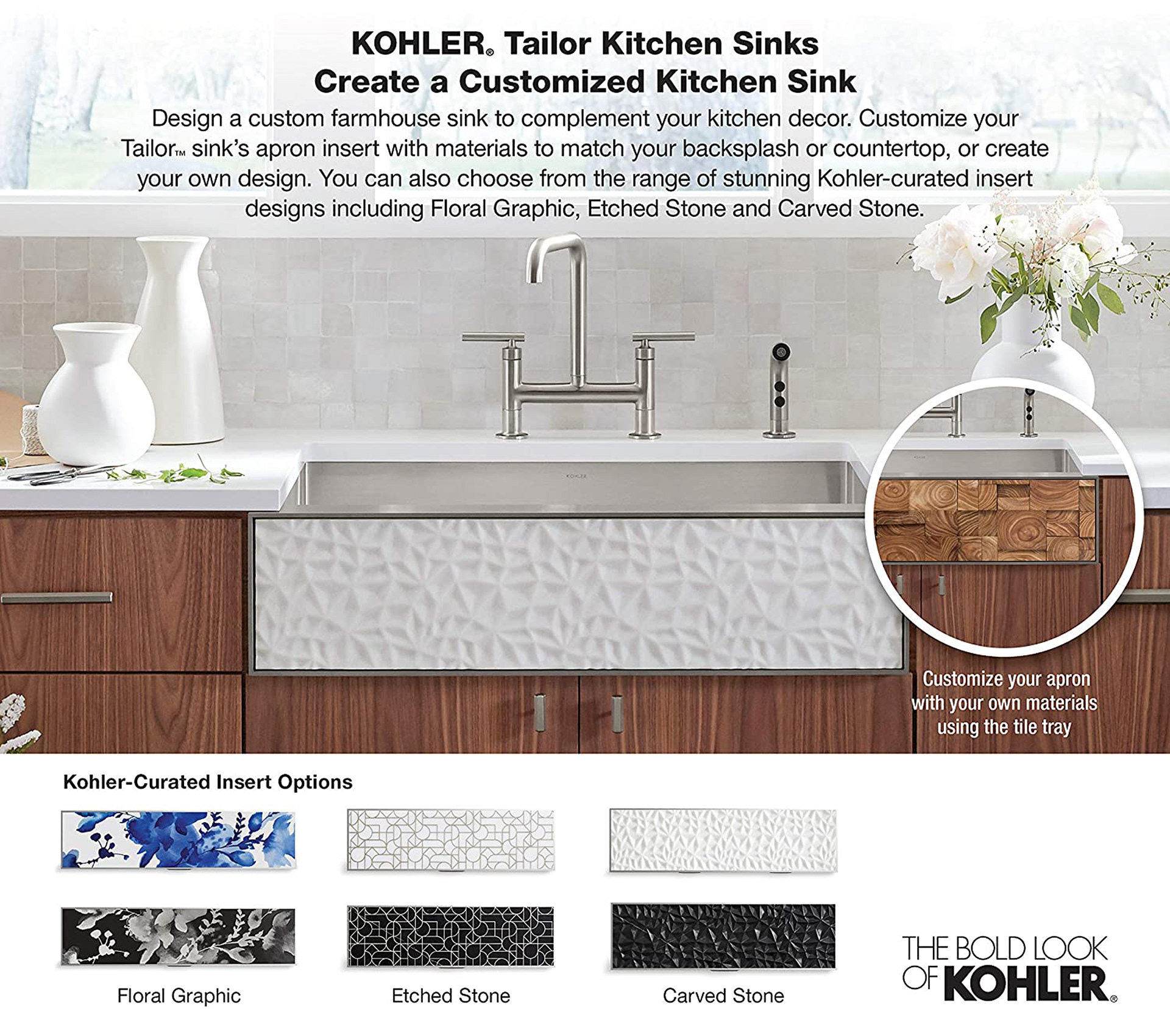 The apron was designed in coordination with countertop fabricators to allow for customers to insert excess countertop material (up to 3cm) safely and securely into the apron or insert a tile tray that matches their backsplash. Or the consumer can choose from a range of KOHLER curated designs including Etched Stone, Carved Stone and Flora inserts.