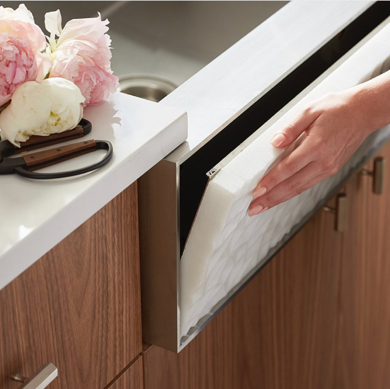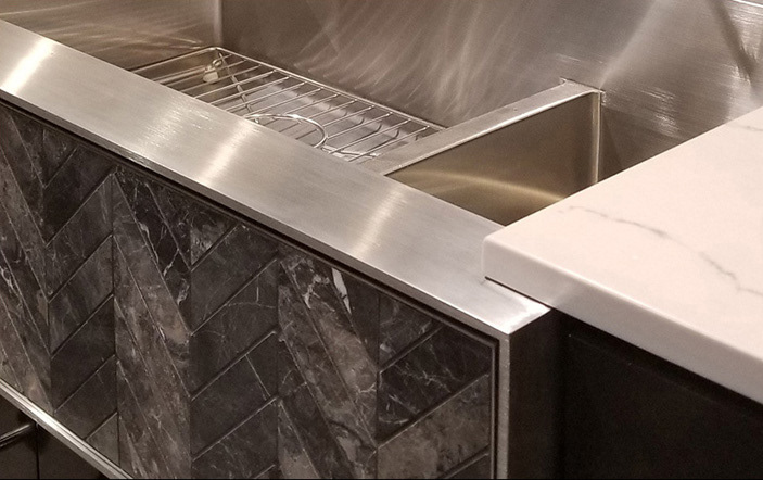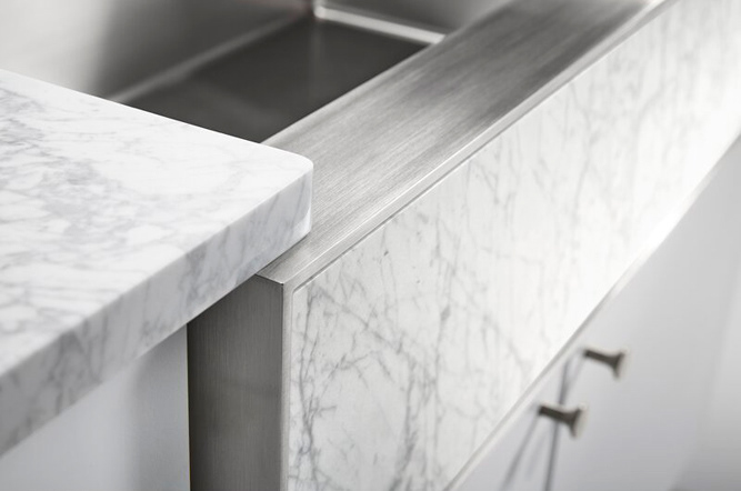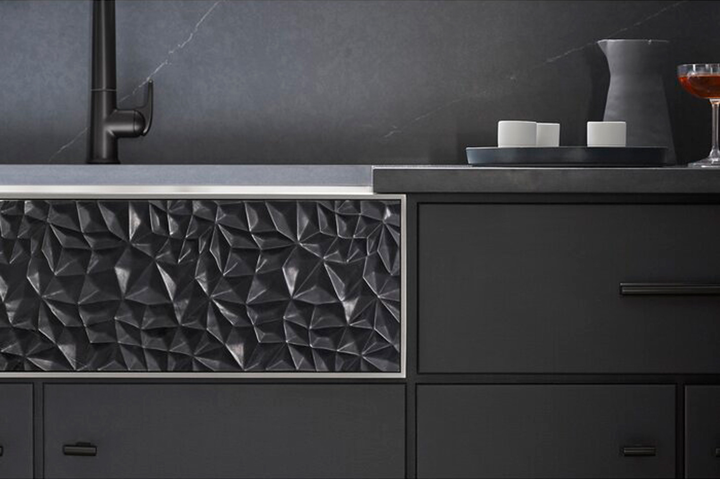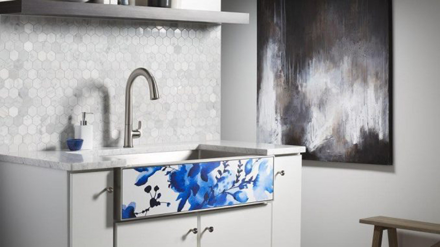 The apron was designed in coordination with countertop fabricators to allow for customers to insert excess countertop material (up to 3cm) safely and securely into the apron or insert a tile tray that matches their backsplash. Or the consumer can choose from a range of KOHLER curated designs including Etched Stone, Carved Stone and Flora inserts.