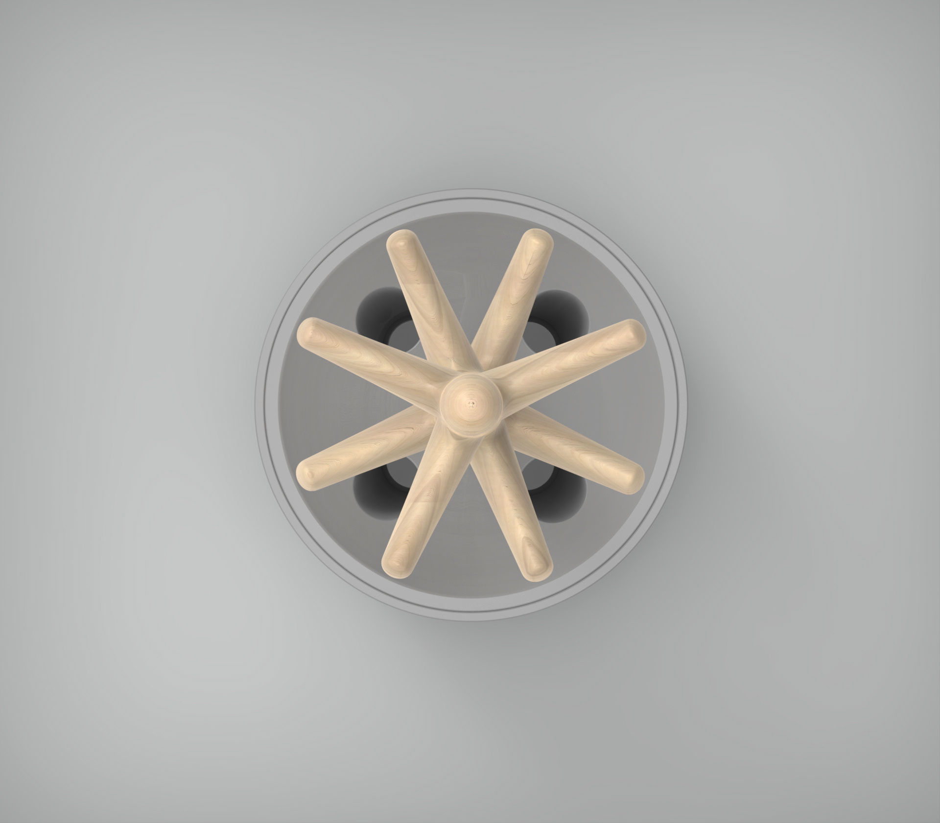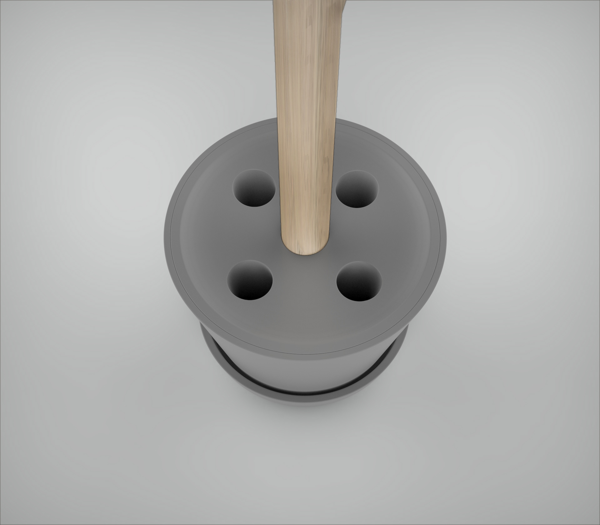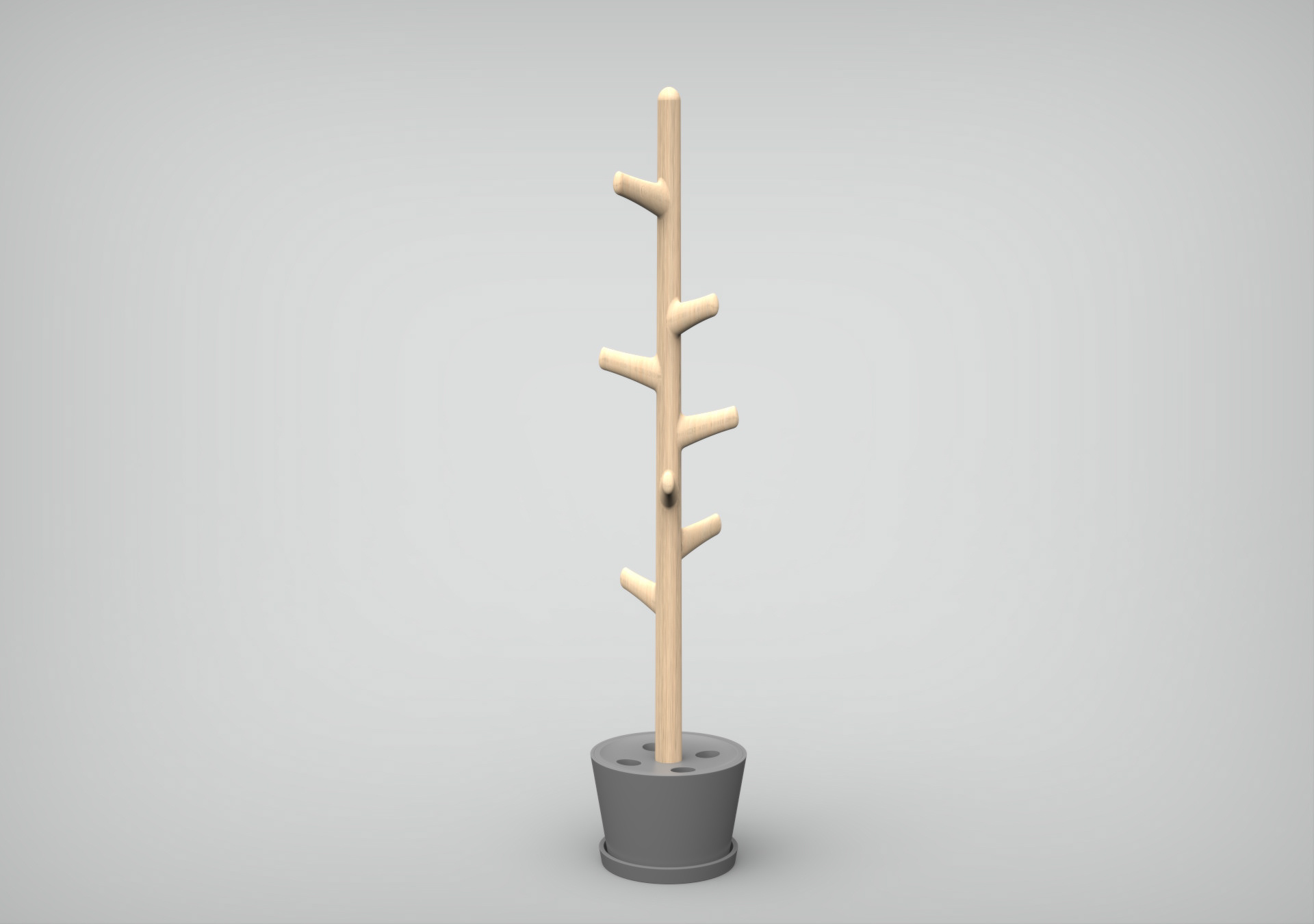 Though not apparent from the rendering; the construction of this coat rack would be CNC lathed trunk; with separately lathed and attached limbs (mortise and tenon).