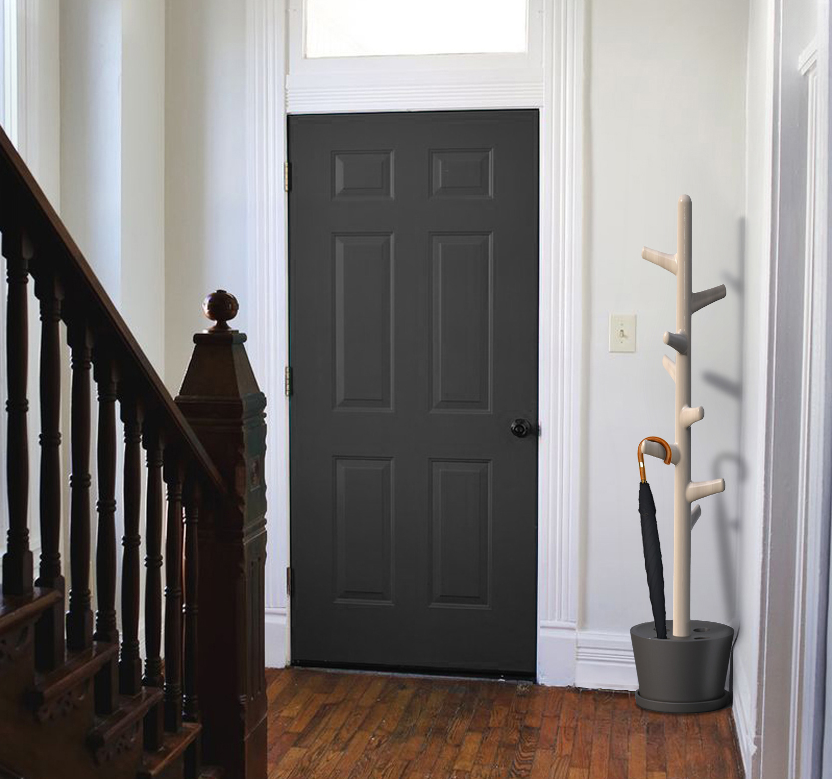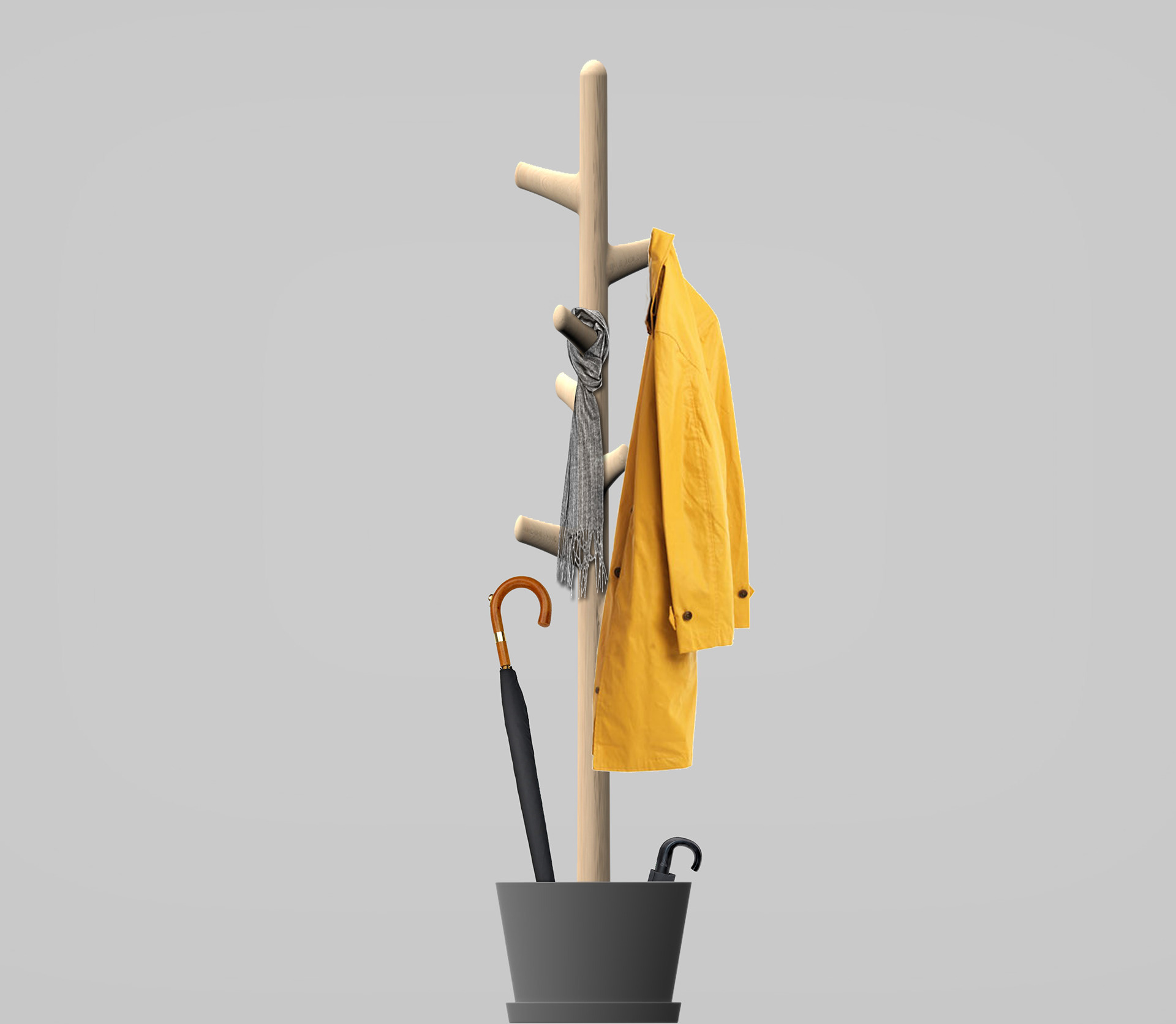 Scandinavian-inspired Coat Rack -- inspired by nature and incorporating rounded "limbs" to hold personal clothing items such as coats + rain jackets, umbrellas, scarves and hats.