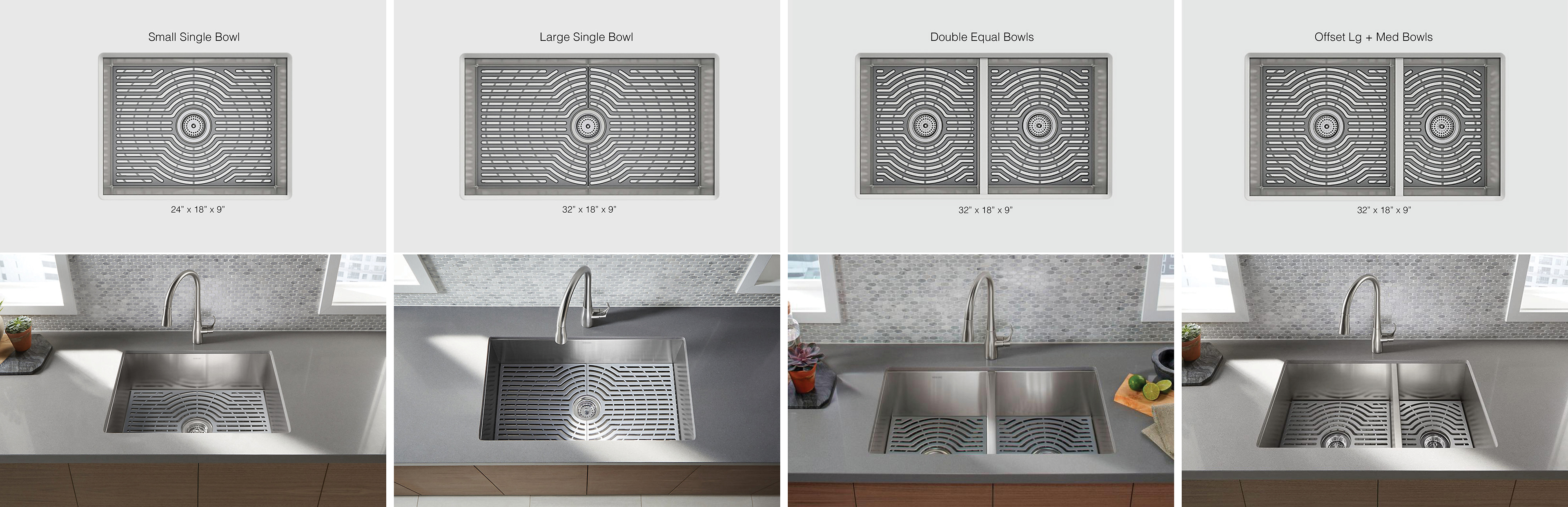 My most satisfying contribution to this project (apart from the design of the actual sinks) was the design of various sets of silicone mats we decided to offer for this assortment. It was our first foray into silicone as a material for sink mats for this entry-level price point; instead of the more traditional steel wire racks.
